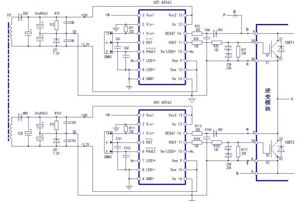 驅動脈沖從A316J的11腳輸出,經R74、R75柵極電阻引入到模塊內部IGBT的G極。R77為柵極旁路電阻,Z34、Z35為柵、射極正負偏壓嵌位穩壓管,保護IGBT的輸入回路的安全。