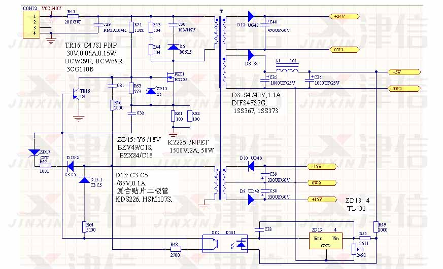 到此雖然檢修過(guò)程結(jié)束,但工作并未完成:此電源板電路是LG IS5 系列幾千瓦到幾十千瓦變頻器的通用CPU 電源板,故繪出此電路圖并標(biāo)注出某些元件的參數(shù)及代換型號(hào)。當(dāng)以后遇到同樣的機(jī)器時(shí),在找不到原型號(hào)可找代換的,如果連代換的也找不到的話就以能購(gòu)置到且性能最相近的元器件裝機(jī)。更重要的是,不再怕被別人修過(guò)的同型號(hào)“轉(zhuǎn)修機(jī)”,即我們行內(nèi)常說(shuō)的“同行機(jī)”——丟失或是換錯(cuò)元器件的機(jī)子。