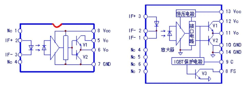 在變頻器驅(qū)動線路中,為了保證控制端和驅(qū)動端的電氣隔離,會使用光耦芯片作為控制信號轉(zhuǎn)驅(qū)動信號的耦合元件。其中,比較常見的光耦芯片有6腳,8腳,16腳幾種封裝,比如HCPL3150,HCPL316J,PC923,PC929,TLP350,TLP520,F(xiàn)OD3120等,其中16腳封裝的還集成了管壓降檢測功能,下面以PC923,PC929為例,介紹一下光耦芯片的作用和功能。