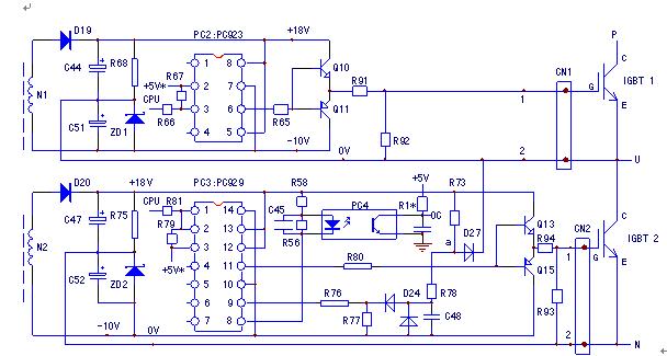 PC929驅(qū)動IC是兼有對驅(qū)動脈沖隔離放大和模塊故障檢測雙重“身份”的。由CPU主板來的脈沖信號從1/2、3腳輸入到PC929內(nèi)部的光電耦合器,從11腳輸出后,經(jīng)Q13、Q15兩級互補式電壓跟隨器的功率放大后,引入IGBT2的G極。此為驅(qū)動脈沖的信號傳輸電路路;?PC929的9腳為模塊故障檢測信號輸入腳。正常工作狀態(tài)下,PC929的11腳輸出正的激勵脈沖電壓,使Q13導通,Q15截止。Q13的導通,將正偏壓加到IGBT2的G極上,IGBT2進入飽合開通狀態(tài)。忽略IGBT導通管壓降的話,IGBT2的導通即將U輸出端與負直流供電端N短接起來,提供輸出交流電壓的負半波通路,在導通期間,只要變頻器是在額定電流以內(nèi)運行,IGBT2的正常管壓降應在3V以下。