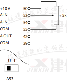 12、27短接,50、53、55接電位器,其中53為電位器中間抽頭,接線前確認(rèn)控制卡上(面板拿下來右下角)53撥位開關(guān)是否在U端,設(shè)置參數(shù)3-15改為1、6-10端子53低電壓、6-11端子53高電壓、6-14 53參考反饋低、6-15 53參考反饋高。